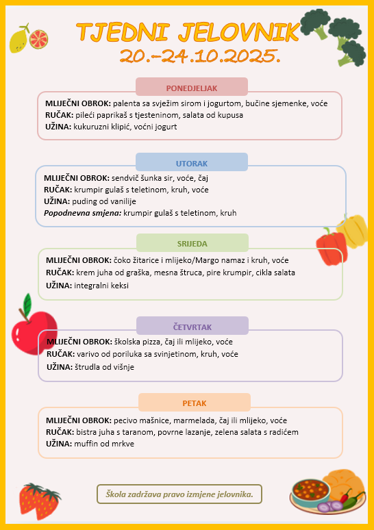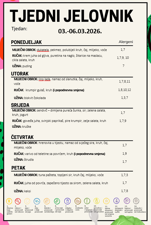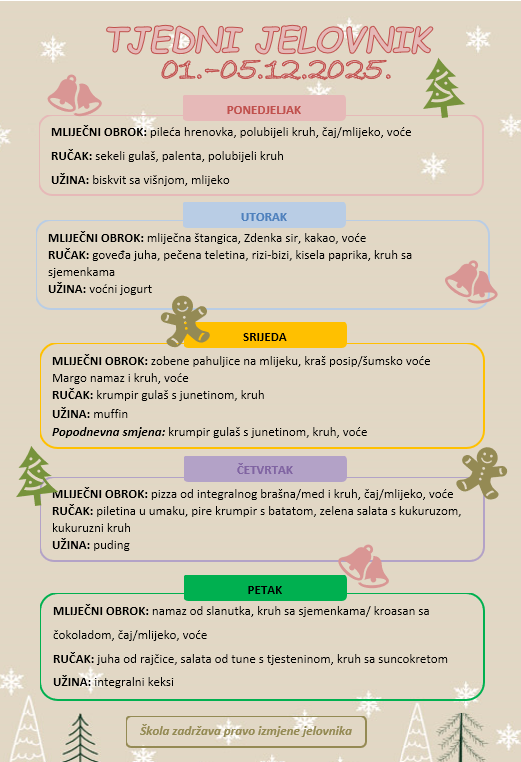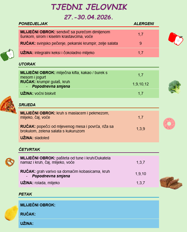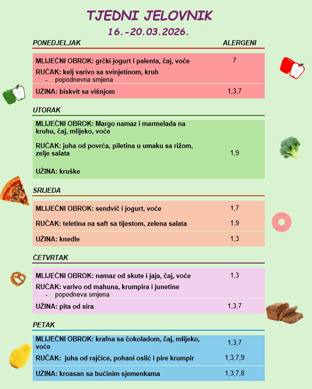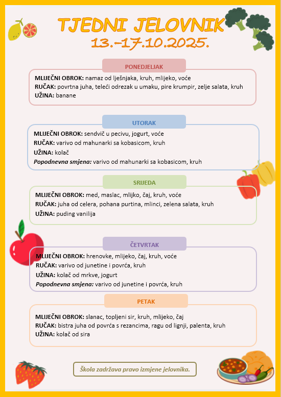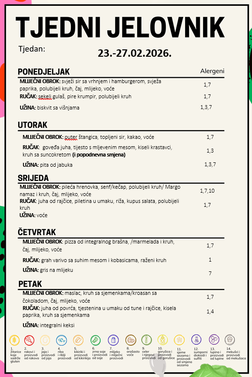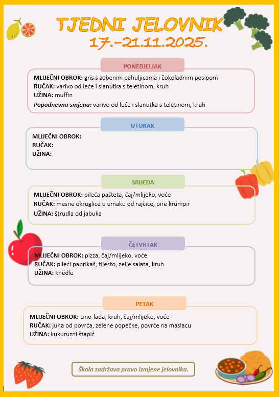 Tjedni jelovnik Obavijest roditeljima! Sva djeca imaju svakodnevno u ponudi dvije vrste žitarica s mlijekom ili jogurtom.